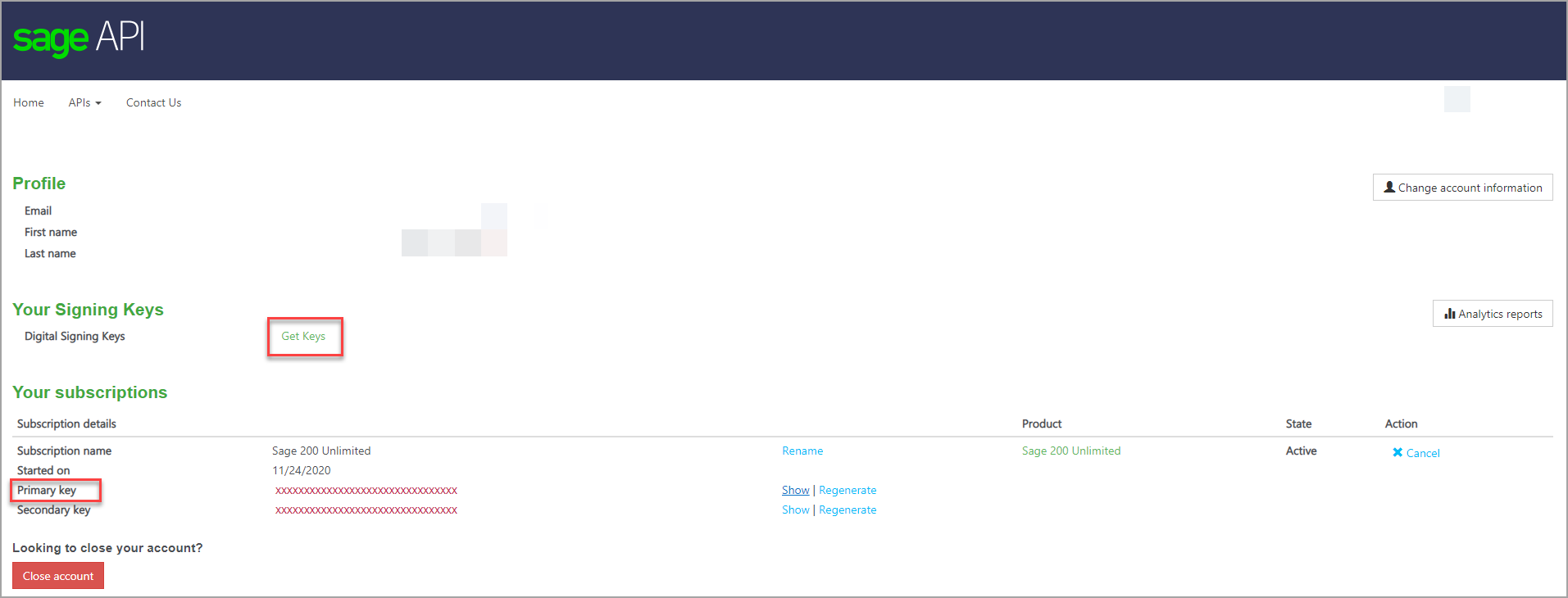 When your registration is complete, you're automatically taken to your account profile. - Return to the Sage API page.
